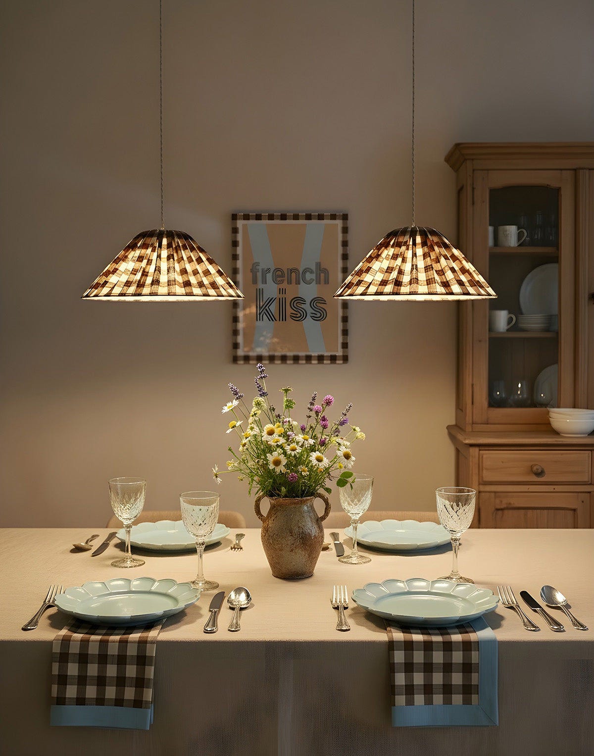Love this so much!! I’m trying to find a light to go over our long wooden table (it’s a a medium tone brown) with dark brown chairs. I was leaning wicker, but we have rattan Roman shades directly behind the table, so I’m feeling like it may be too much brown. Perhaps something linen?